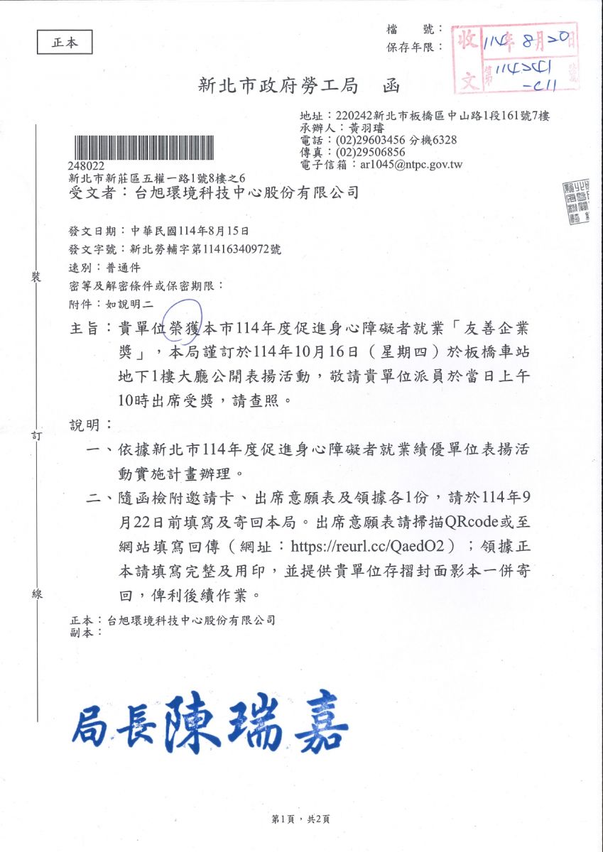 台旭環境科技中心榮獲 114年度 新北市身心障礙者友善進用單位 (友善企業獎)