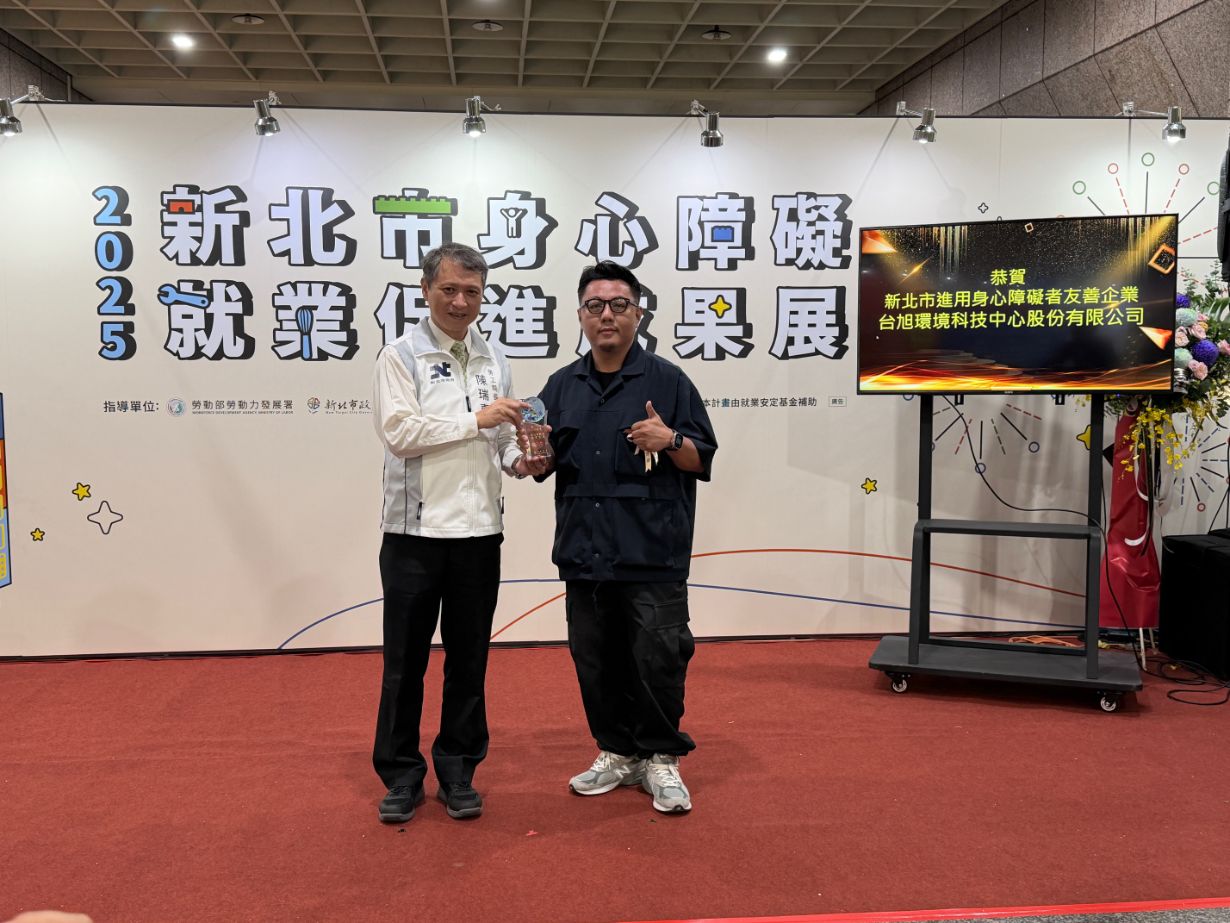 新北市勞工局16日於板橋車站B1舉辦「114年身心障礙就業促進成果展」,局長陳瑞嘉表揚22家績優進用單位,台旭環境科技中心獲頒「友善企業獎」,展現企業善盡社會責任、促進多元共融的具體行動。
