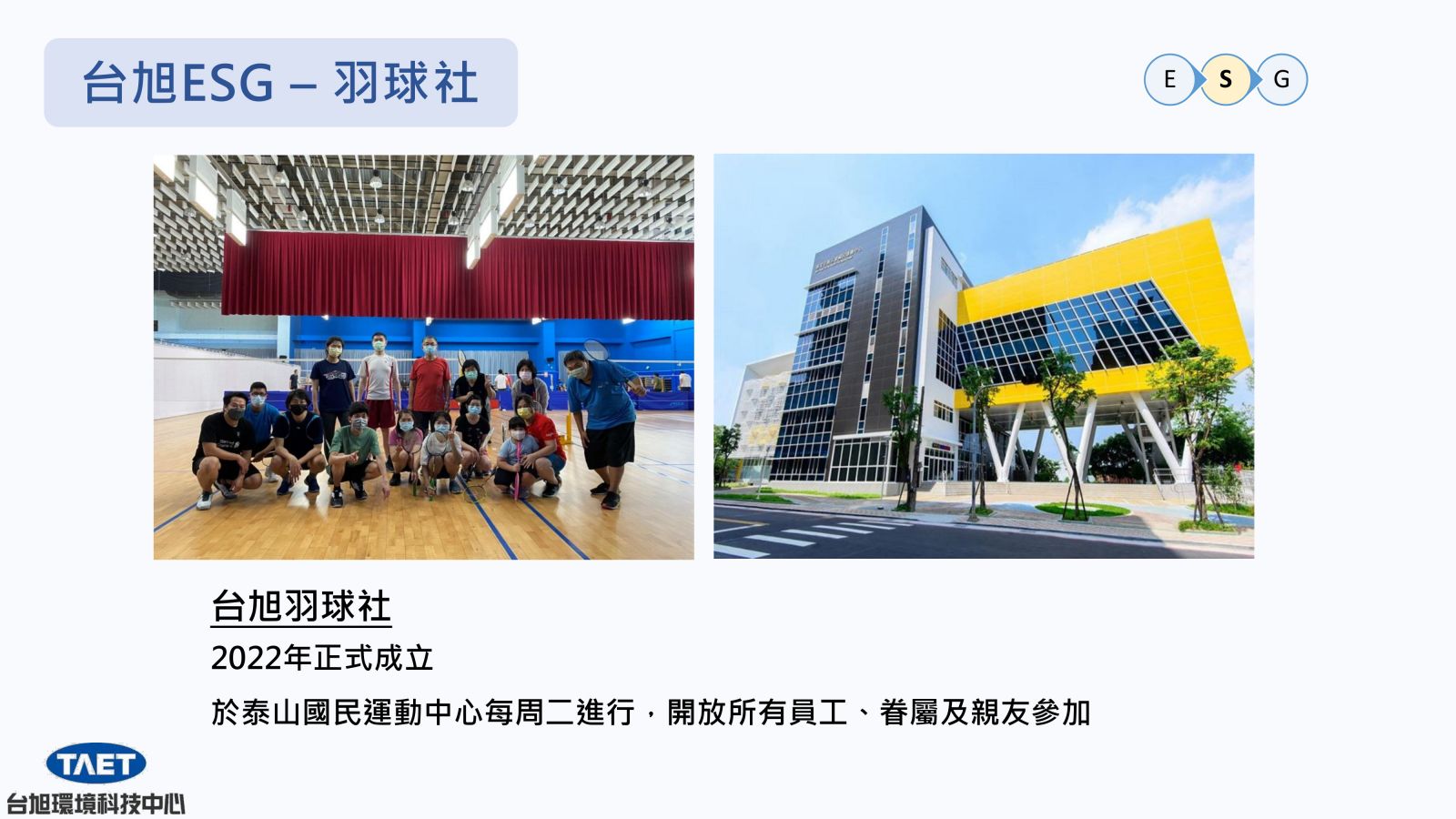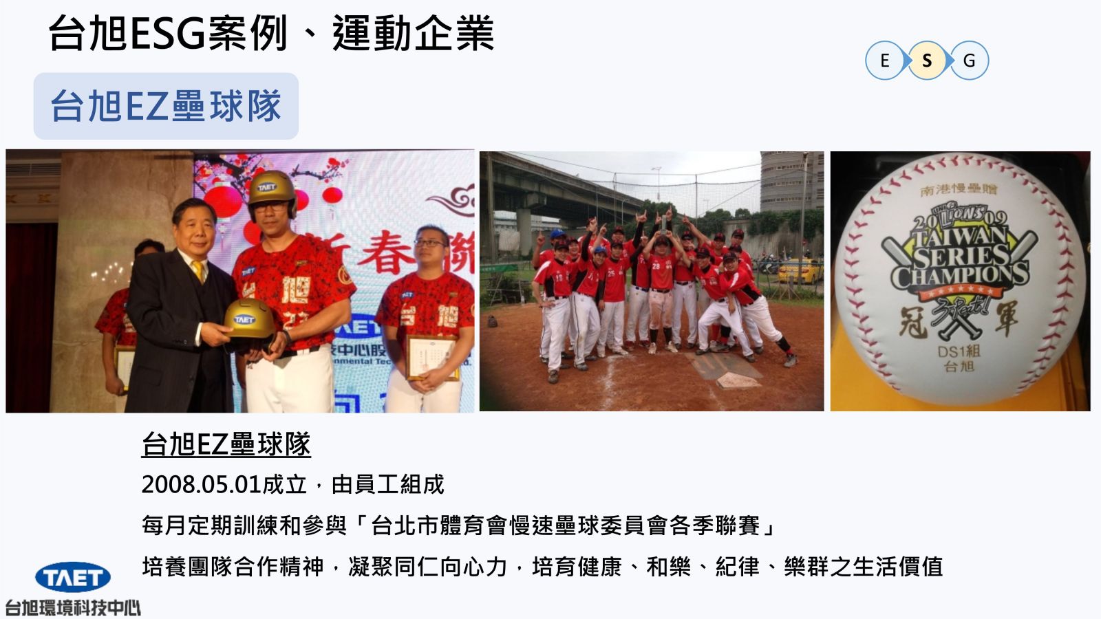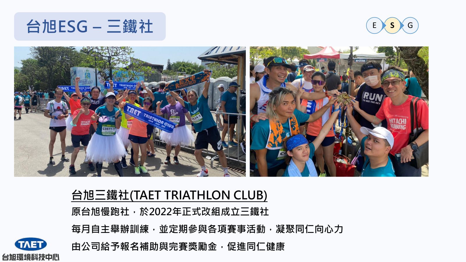創造友善職場環境是台旭的核心經營方針之一,也是企業社會責任(CSR)及落實ESG永續治理的重要實踐方向。在推廣運動與健康方面,除了多年來由員工自發組成、持續活躍的「台旭EZ壘球隊」外,公司亦於2022年成立「三鐵社」與「羽球社」,並提供員工多元的健康與休閒福利措施,包括運動賽事觀賞補助、員工旅遊及年度健康檢查等,積極營造兼顧工作與生活平衡的職場環境。